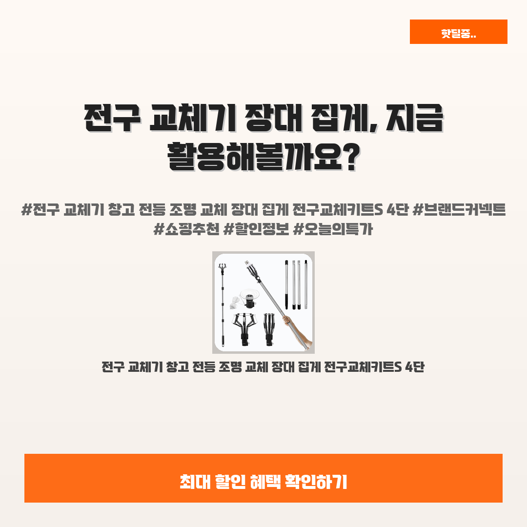 🛍️ 이 포스팅은 네이버 쇼핑 커넥트 활동의 일환으로,판매 발생 시 수수료를 제공받습니다.전구 교체기 장대 집게, 지금 활용해볼까요?여러분의 조명 교체 고민을 단번에 해결해 줄 전구 교체기 창고 전등 조명 교체 장대 집게 전구교체키트S 4단을 소개합니다!처음에는 조명이 깜빡이거나 어두운 공간에서 머뭇거리셨던 적이 있죠? 그럴 때마다 전구 교체가 번거로운 일이었을 거라 생각해요. 하지만 이제 그런 걱정은 그만! 이 제품 하나로 안전하고 간편하게 조명 교체를 해결할 수 있습니다.저도 처음 사용했을 때 "진짜 이렇게 간단하게 교체할 수 있다니!"라며 놀랐던 기억이 납니다. 지금, 여러분도 이 편리함을 경험해 보세요! 확실한 성능과 가성비를 자랑하는 이 전구 교체기, 여러분의 일상을 더욱 빛나게 만들어 줄 것..