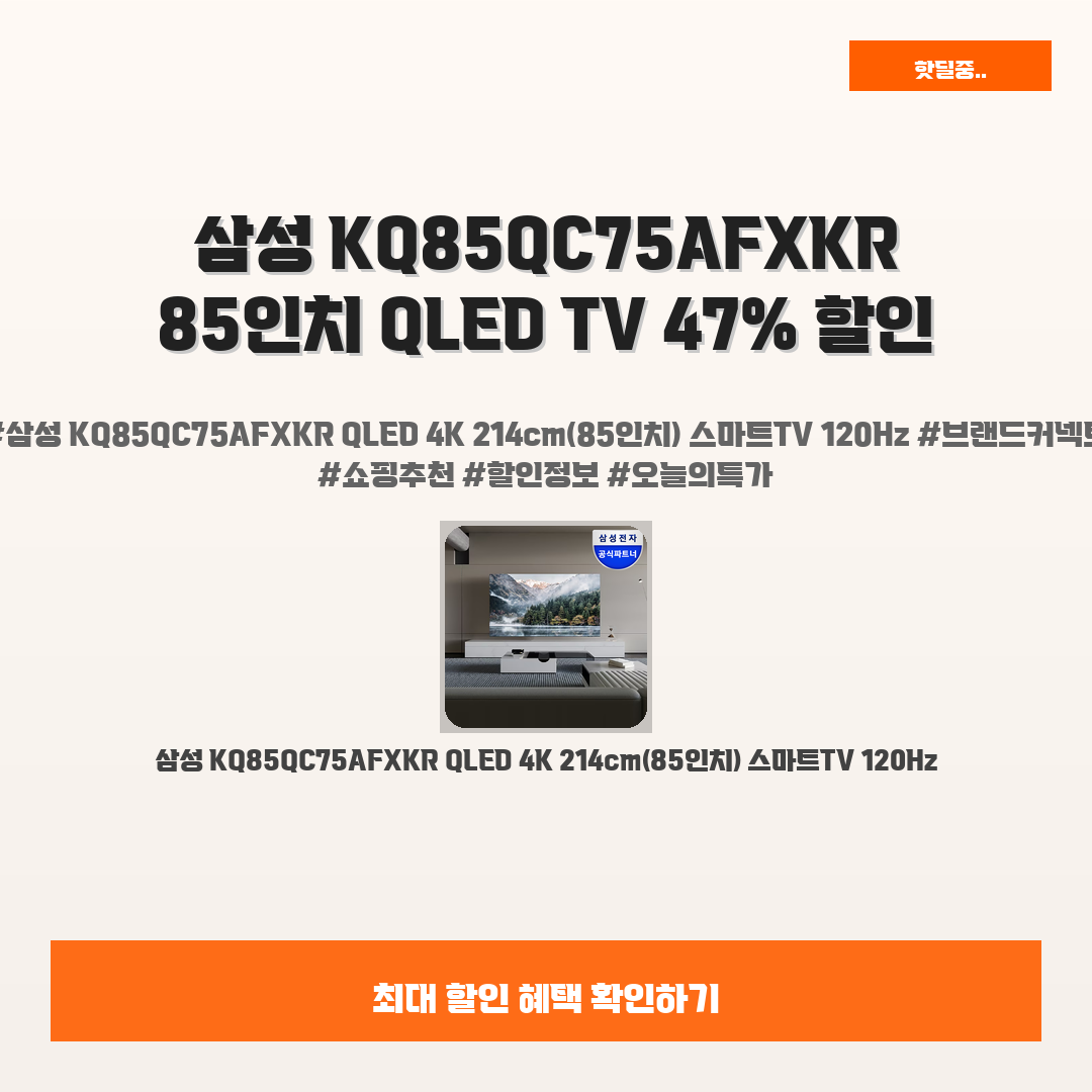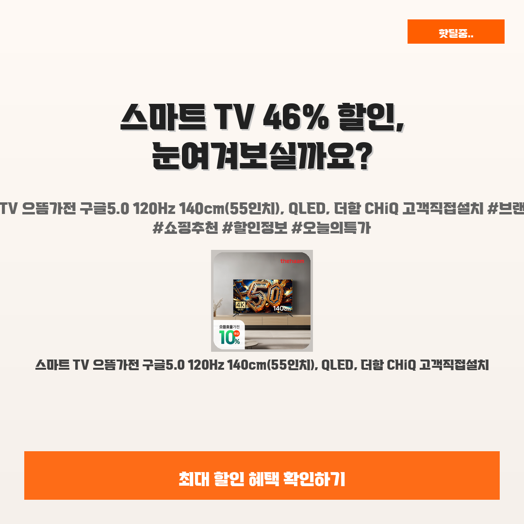 🛍️ 이 포스팅은 네이버 쇼핑 커넥트 활동의 일환으로,판매 발생 시 수수료를 제공받습니다.오늘 소개할 제품은 단연코,,그야말로 최고의 선택, 막강한 성능의 스마트 TV 입니다!혹시 여러분도 집에서 영화나 게임을 즐길 때,"스마트 TV 으뜸가전 구글5.0 120Hz 140cm(55인치), QLED, 더함 CHiQ 고객직접설치"를 꿈꿔본 적 있으신가요? 이젠 그 꿈이 현실로 다가왔습니다!최근의 인기 있는 방송이나 영화는 물론,고해상도 화면과 놀라운 색감을 자랑하는 이 스마트 TV로 더욱 풍성한 시청 경험을 누릴 수 있어요. 아, 그리고 가격도 단돈 479,000원으로, 무려 46% 할인된 가격! 너무 믿기지 않죠?뛰어난 성능과 합리적인 가격, 이 모든 것을 갖춘 스마트 TV를 통해즐거운 가정의 TV 시간을..