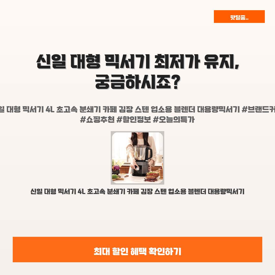 🛍️ 이 포스팅은 네이버 쇼핑 커넥트 활동의 일환으로,판매 발생 시 수수료를 제공받습니다.오늘 소개할 제품은 단연코,,신일 대형 믹서기 4L 초고속 분쇄기로, 카페 운영이나 큰 김장에 딱 맞는 제품이에요!혹시 대용량 믹서기를 찾고 계신가요? 집에서나 업소용으로 활용할 만한 믹서기가 필요하신 분들께 이 기회를 놓치지 말라고 말씀드리고 싶어요!"신일 대형 믹서기"는 사용자의 다양한 요구를 충족시켜 줄 수 있는 완벽한 선택이에요.이 믹서기로 직접 만든 요리는 상상 이상의 맛을 선사할 거예요. 여러분의 요리 레시피에 그야말로 신의 한 수와 같은 기쁨을 줄 믹서기를 만나보세요!저도 이 제품을 사용한 뒤로 부쩍 요리에 재미를 느끼게 되었답니다. 이제는 제 친구에게도 강력 추천 중이에요!가성비와 성능 모두 만족스러..