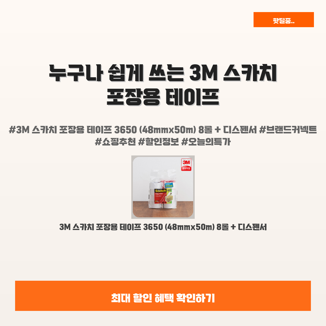 🛍️ 이 포스팅은 네이버 쇼핑 커넥트 활동의 일환으로,판매 발생 시 수수료를 제공받습니다.오늘 소개할 제품은 단언컨데,,그야말로 누구나 쉽게 쓸 수 있는 3M 스카치 포장용 테이프 3650랍니다!포장할 일이 많아지는 계절, 소중한 물건을 완벽하게 포장하고 싶지 않으신가요? 하지만 고품질 포장재를 찾는 게 쉽지 않죠. 여러분의 고민을 덜어줄 이 제품 정말 추천해요!믿을 수 있는 3M의 기술로 만들어진 이 테이프는 탁월한 접착력과 변색 없는 내구성으로 고객님을 만족시킬 거예요.지금 8롤과 디스펜서 세트로 11,900원에 만나보세요!여러 패키지와 다양한 작업에 적합한 이 테이프는 25% 할인과 함께 더 많은 행복을 선사할 거예요! 한 번 써보시면 절대 후회하지 않으실 거예요!3M 스카치 포장용 테이프 365..