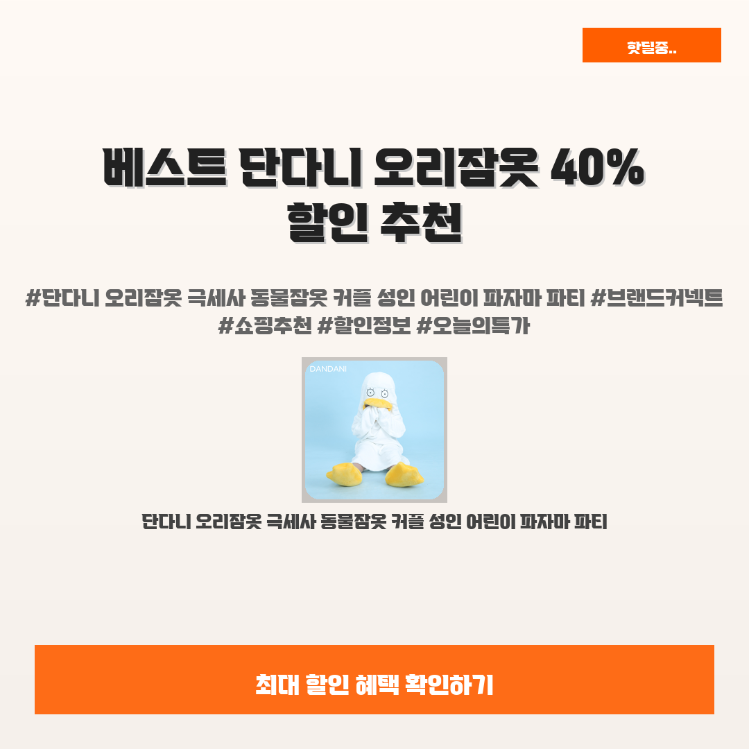 🛍️ 이 포스팅은 네이버 쇼핑 커넥트 활동의 일환으로,판매 발생 시 수수료를 제공받습니다.오늘 소개할 제품은 단언컨데,,그야말로 완벽한, 갓벽한, 감동적인 선택입니다!여러분, 요즘 파자마 파티 준비하고 계신가요? 단다니 오리잠옷 극세사 동물잠옷 커플 성인 어린이가 딱이에요! 정말 답답한 겨울밤, 따뜻하고 편안한 잠옷 하나로 가족과 친구들과 함께하는 시간을 더욱 특별하게 만들 수 있답니다."이게 뭐야?"라는 반응이 바로 나올 만큼, 정말 매력적인 제품이에요. 부드럽고 포근한 극세사 소재로 만든 이 잠옷은 착용감이 너무 좋고, 그 자체로도 기분을 한층 업 시켜준답니다. 40% 할인으로 지금 바로 만나보세요!이 행복한 순간을 여러분도 느껴보셨으면 좋겠어요. 단다니 오리잠옷로 소중한 사람들과 함께라면, 그 어..