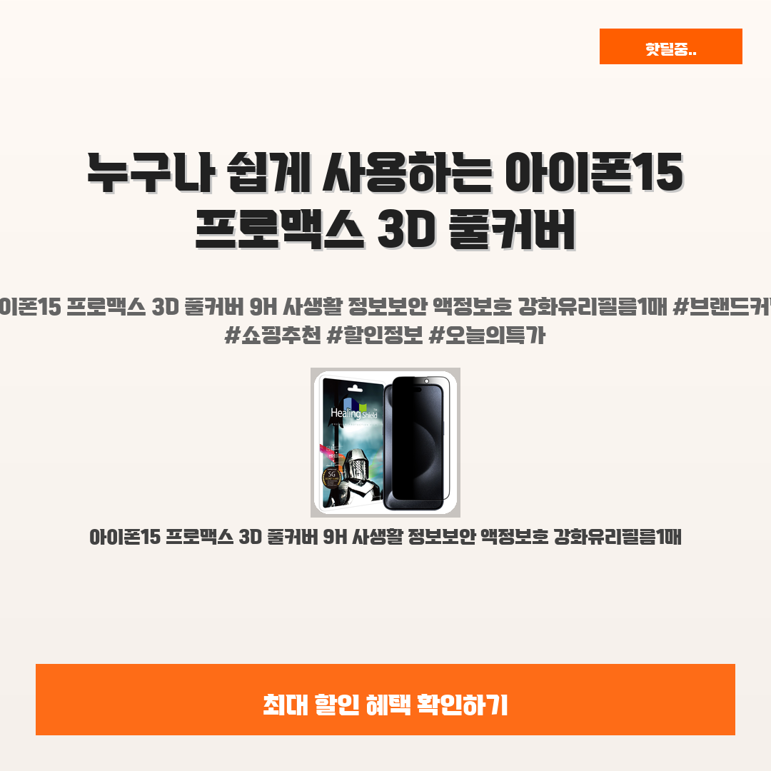 🛍️ 이 포스팅은 네이버 쇼핑 커넥트 활동의 일환으로,판매 발생 시 수수료를 제공받습니다.오늘 소개할 제품은 단연 독보적입니다!바로 아이폰15 프로맥스 3D 풀커버 9H 사생활 정보보안 액정보호 강화유리필름1매입니다.혹시, 여러분의 소중한 아이폰을 사용하면서 화면 보호에 걱정이 많으신가요? 친구들이나 가족들, 혹은 직장 동료에게 평범한 액세서리로 비추어지기 쉬운 문제점!이 강화유리필름은 그런 고민을 한 번에 해결해 줄 완벽한 선택입니다. 보호 성능 우수한 9H 강도와 3D 풀커버 디자인으로 사생활을 보호하며, 무엇보다도 가성비가 뛰어납니다! 정말로 만족한다는 이유를 직접 경험해 보세요!게다가 현재 10% 할인 중이니, 지금이 바로 최적의 구매 시점! 여러분도 이 기회를 놓치지 마세요. 아이폰15 프로맥..
