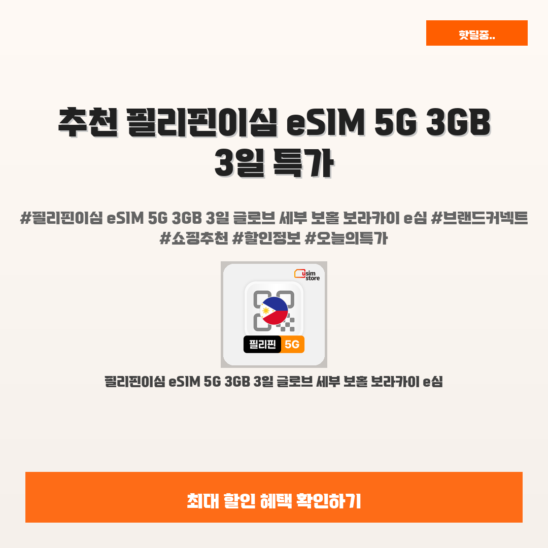🛍️ 이 포스팅은 네이버 쇼핑 커넥트 활동의 일환으로,판매 발생 시 수수료를 제공받습니다.지금 바로 확인하세요!여러분의 여행을 더욱 특별하게 만들어줄 필리핀이심 eSIM 5G 3GB 3일이 찾으시는 해답입니다!필리핀의 아름다운 세부, 보홀, 보라카이를 방문할 계획이신가요? 여정 동안 원활한 인터넷 연결은 필수죠!그러나 고가의 로밍 요금이나 복잡한 데이터 카드 구매는 이제 그만.필리핀이심 eSIM 5G 3GB 3일으로 여행 중 언제 어디서나 편리하게 인터넷을 즐기세요!이 제품은 특히 글로브 통신망을 통해 안정적인 서비스와 빠른 속도를 제공합니다.가성비 좋은 가격으로 부담 없이 여행의 즐거움을 만끽할 수 있으니, 이 기회를 놓치지 마세요!이제는 걱정 없는 여행을 위한 첫걸음을 내딛을 시간입니다.※ 이거 진..