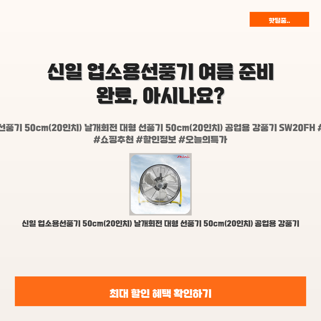 🛍️ 이 포스팅은 네이버 쇼핑 커넥트 활동의 일환으로,판매 발생 시 수수료를 제공받습니다.여름 준비는 이렇게!바로 신일 업소용선풍기 50cm(20인치)와 함께라면 걱정 끝이죠.무더운 여름, 더위에 지치지 않고 쾌적한 환경을 원하신다면,"신일 업소용선풍기 50cm(20인치) 날개회전 대형 선풍기 SW20FH"가 정답이에요!대형 강풍기로 실내외를 시원하게 만들고,업소에서도 손쉽게 사용할 수 있는 이 제품은 여러분의 여름을 한층 더 특별하게 만들어 줄 거예요.지금 바로 이 시원함을 경험해보세요!여러분의 여름을 더 즐겁고 쾌적하게 만들어줄 궁극의 선택입니다.※ 이거 진짜 제가 직접 써보고 쓰는 리뷰예요 광고 아님!!신일 업소용선풍기 50cm(20인치) 날개회전 대형 선풍기 50cm(20인치) 공업용 강풍기 S..