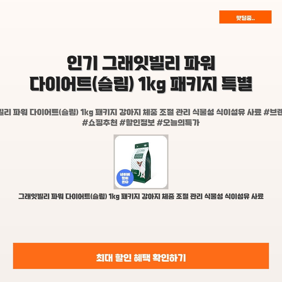 🛍️ 이 포스팅은 네이버 쇼핑 커넥트 활동의 일환으로,판매 발생 시 수수료를 제공받습니다.오늘 소개할 제품은 단연코,,바로 그래잇빌리 파워 다이어트(슬림) 1kg 패키지입니다!반려견의 체중 관리에 고민 많으시죠? 식이섬유 사료로 효과적으로 체중을 조절하는 솔루션이 필요하다면, 더 이상 망설이지 마세요!이 제품은 식물성 식이섬유가 가득해 소화도 잘되면서도 포만감을 높여주어 강아지의 건강한 다이어트를 도와줍니다.강아지가 건강하게 체중을 조절할 수 있도록, 고민에 대한 해결책이 여기 있습니다. 한 번 이용해 보시면 만족감을 느끼실 거예요!그래잇빌리 파워 다이어트(슬림)로 귀여운 친구의 건강한 다이어트를 시작해보세요!※ 이거 진짜 제가 직접 써보고 쓰는 리뷰예요 광고 아님!!그래잇빌리 파워 다이어트(슬림) 1..