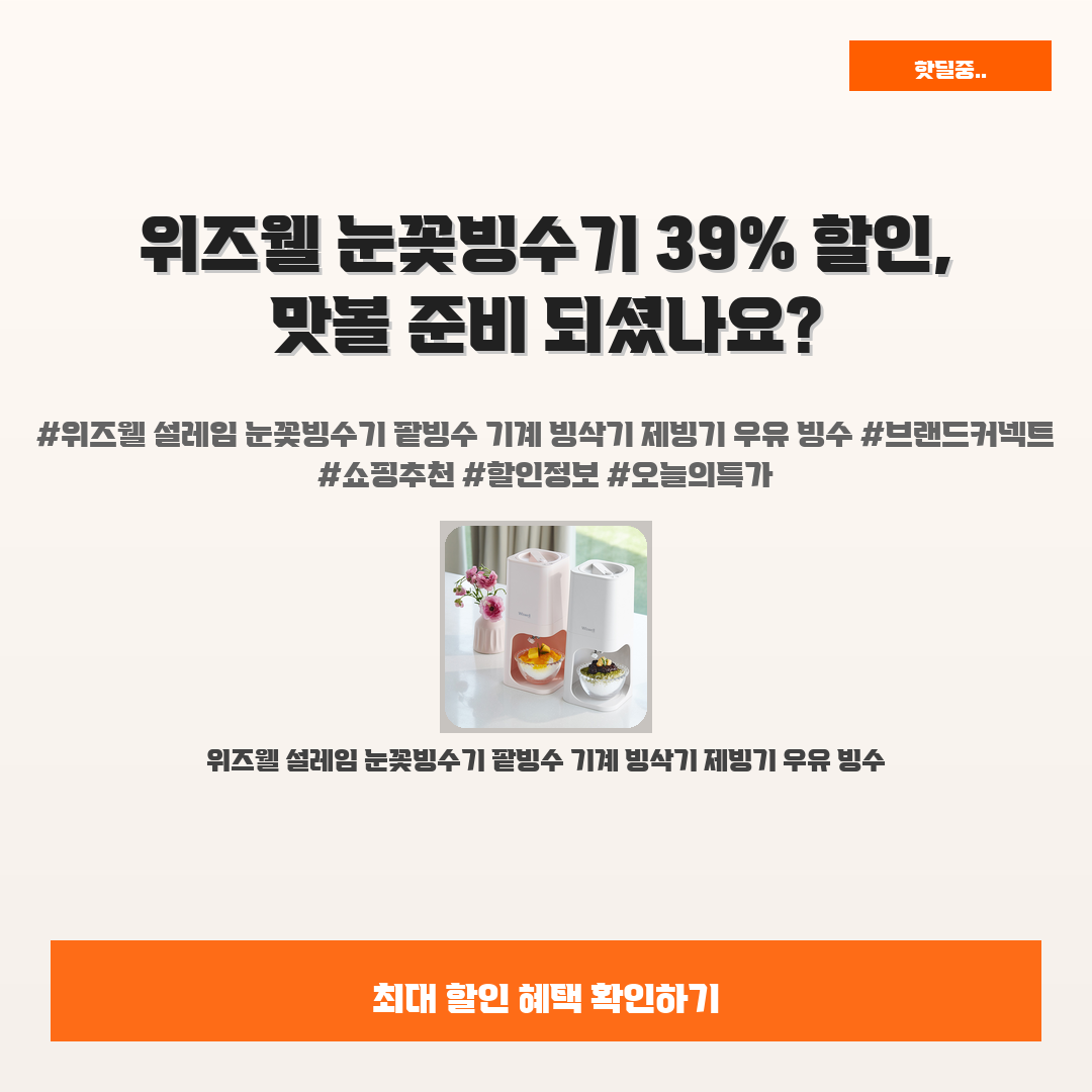 🛍️ 이 포스팅은 네이버 쇼핑 커넥트 활동의 일환으로,판매 발생 시 수수료를 제공받습니다.오늘 소개할 제품은 단언컨데,,여러분의 여름을 시원하게 해줄 위즈웰 설레임 눈꽃빙수기입니다!무더운 여름날, 가끔은 달콤한 팥빙수가 절실하게 생각나지 않나요? 하지만 매번 카페에 가기엔 시간도 돈도 아깝고, 직접 만들어 먹기엔 번거로움이 만만치 않죠.그런 고민을 날려줄 해결책이 바로 위즈웰 빙삭기입니다! 집에서 손쉽게 만드는 부드러운 눈꽃빙수와 맛있는 우유빙수, 상상만으로도 즐거운 여름이 될 거예요!그리고 지금 39% 할인된 놀라운 가격, 불과 59,900원에 이 매력을 누릴 수 있습니다! 더욱 시원한 여름을 위즈웰 설레임 눈꽃빙수기와 함께 만들어보세요!※ 이거 진짜 제가 직접 써보고 쓰는 리뷰예요 광고 아님!!위즈..